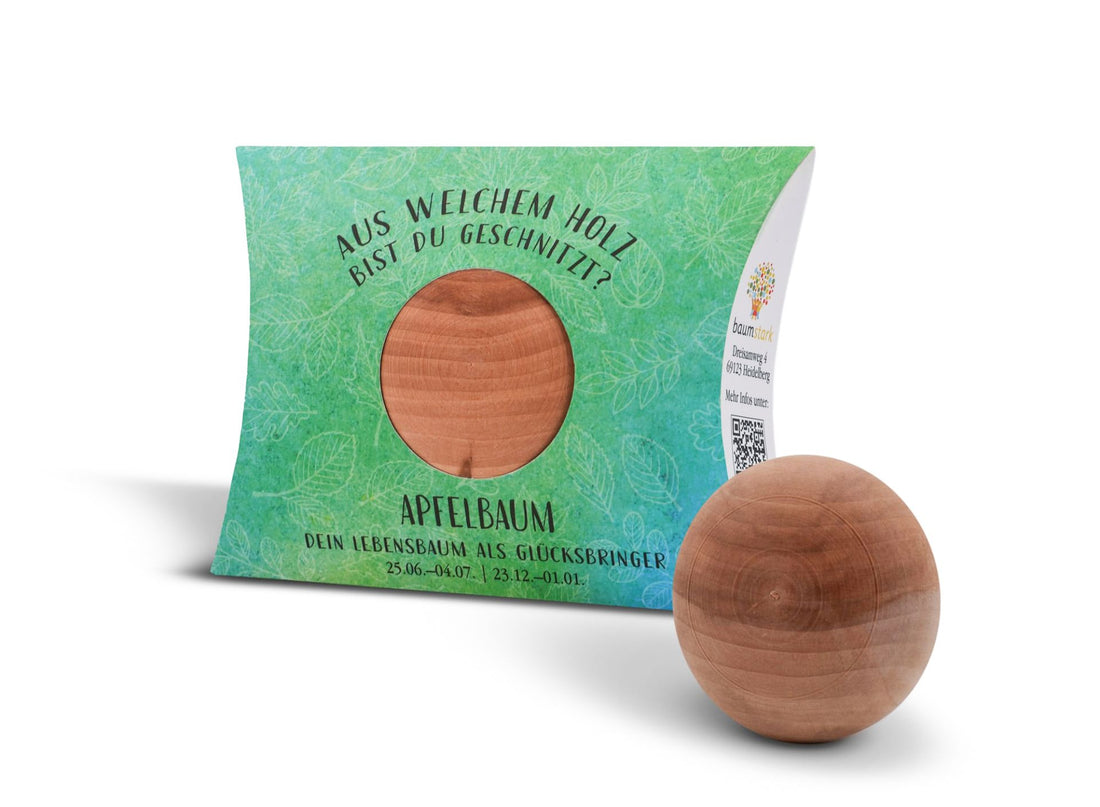 Der Handschmeichler aus Apfelbaumholz ist attraktiv in einer Geschenkverpackung verpackt. Auf deren Rückseite befindet sich...