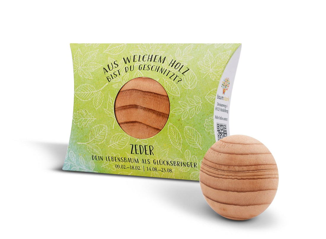 Der Handschmeichler aus Zedernholz ist attraktiv in einer Geschenkverpackung verpackt. Auf deren Rückseite befindet sich...
