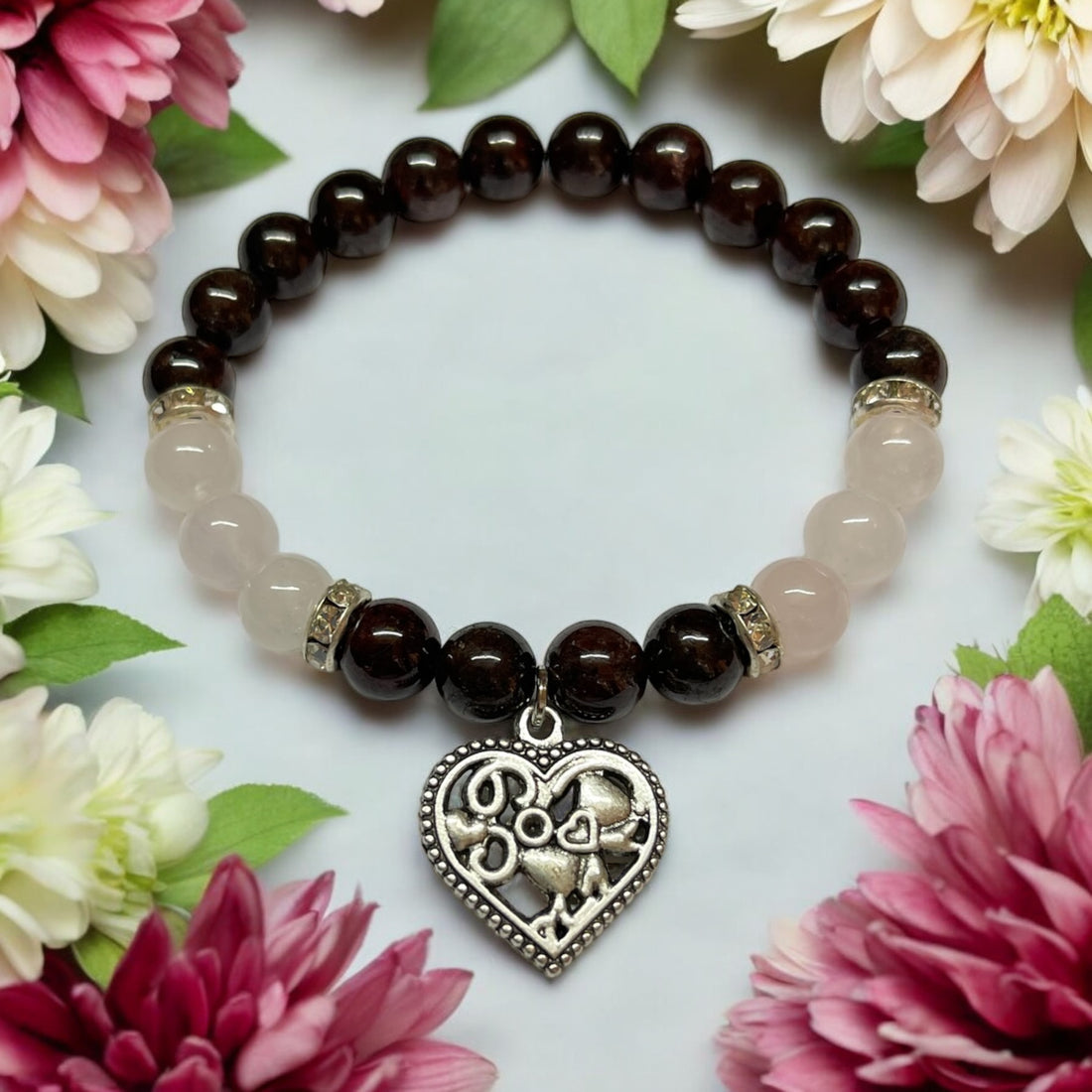 Armband Granat/ Rosenquarz mit Herz