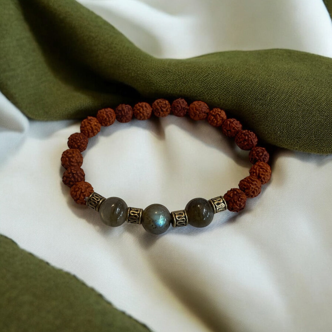 Armband Heilige Perle Rudraksh, LabradoritLabradorit, Rudraksh Ø 10 mm Beschreibung:Der Labradorit löst unterschwellige Anspannungen und...