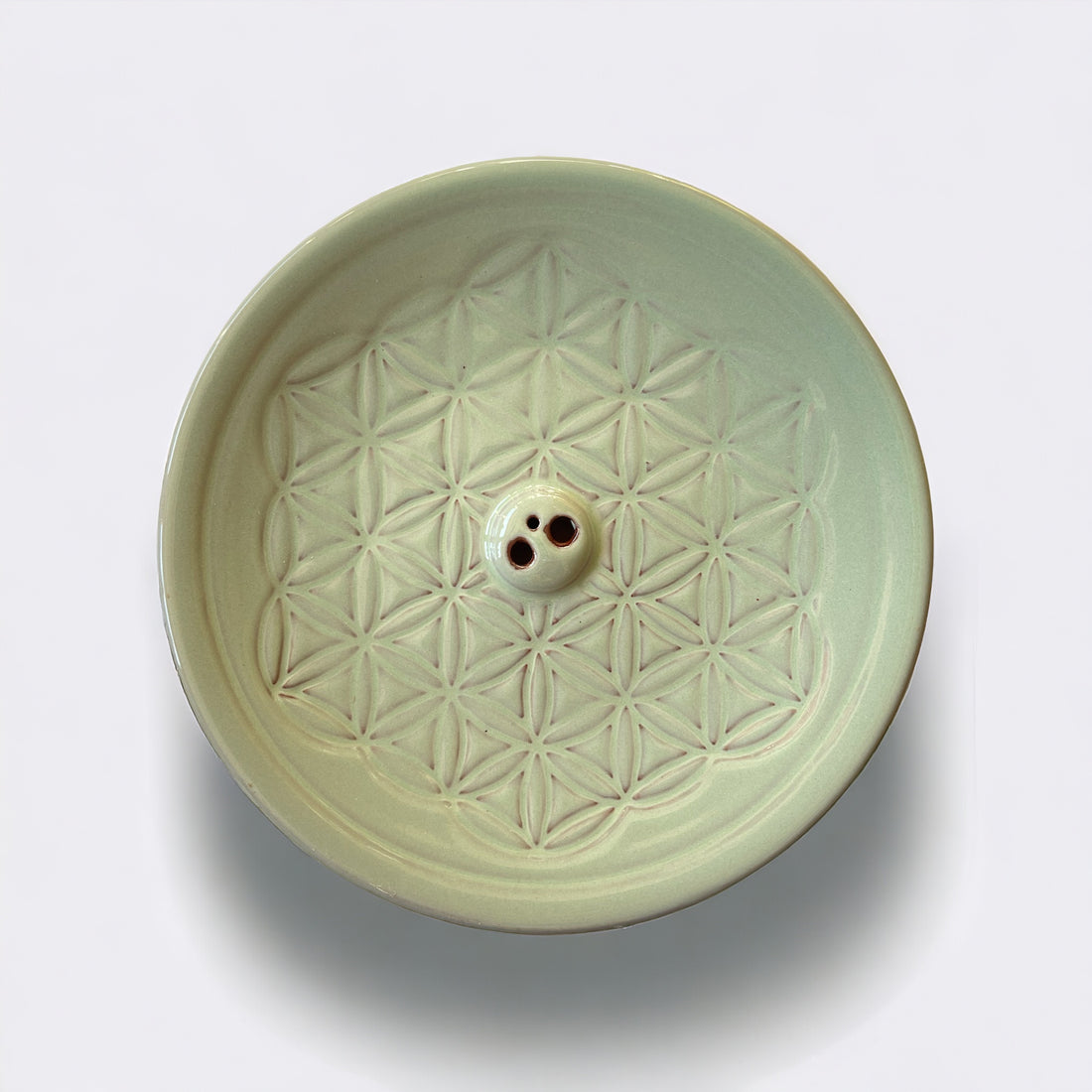 Großer runder Räucherstäbchenhalter aus Ton mit eingravierter Blume des Lebens. Die Blume des Lebens gilt...
