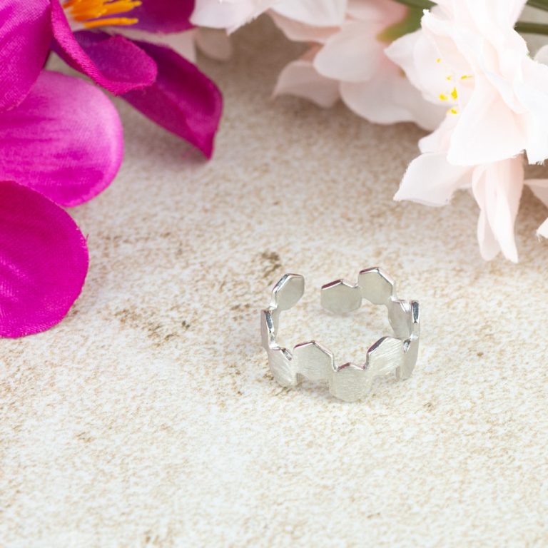 Ein silberfarbener Ring, der aus kleinen, miteinander verbundenen Sechsecken besteht. Der Ring besteht aus Kupfer und ist verstellbar.