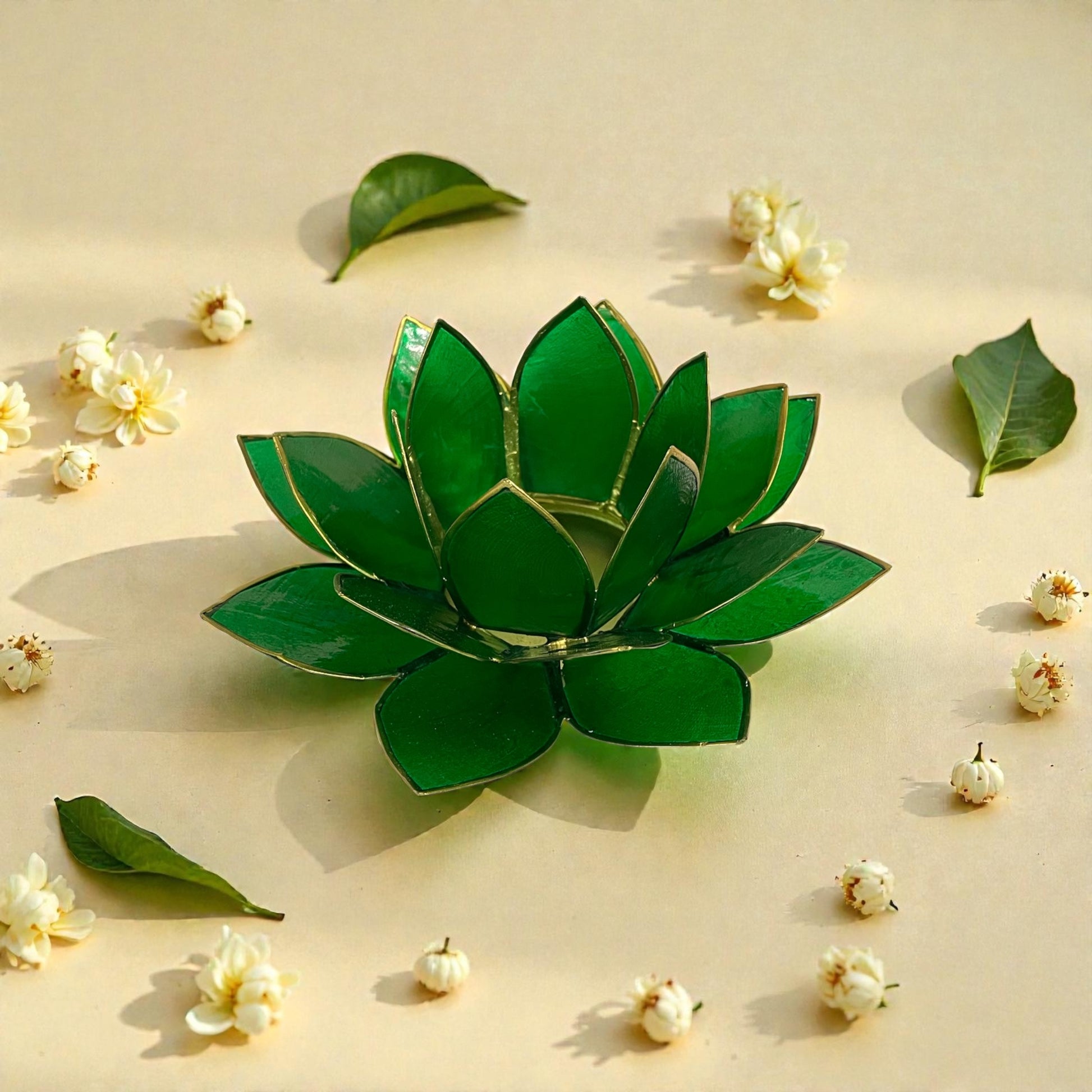 Lotus Teelichthalter – 4. Chakra – grün/goldfarbig