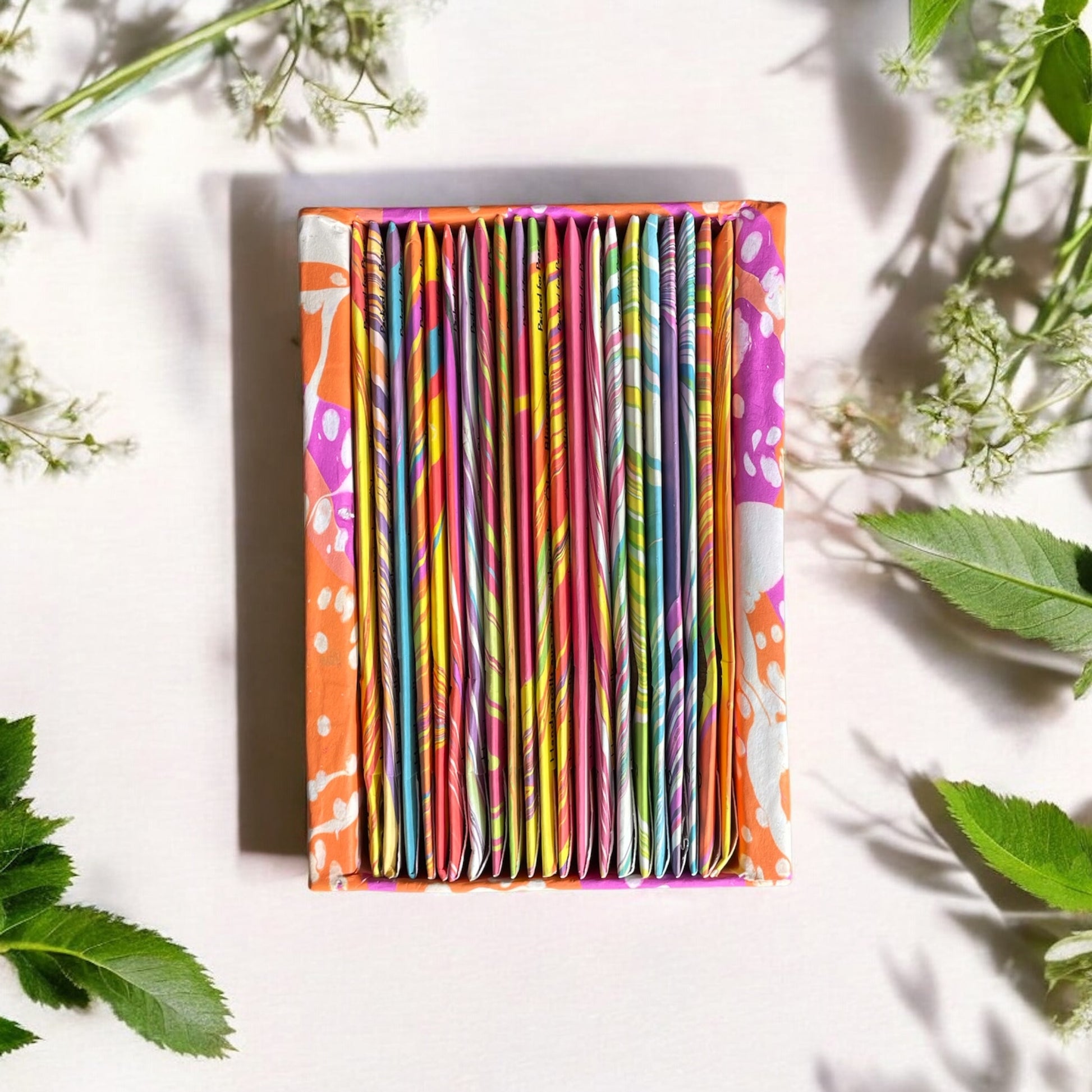 Hergestellt zu fair bezahlten Löhnen in Indien. Handgerollte Räucherstäbchen aus feinen Kräutern und natürlichen, ätherischen Ölen ohne chemische Zusatzstoffe hergestellt.