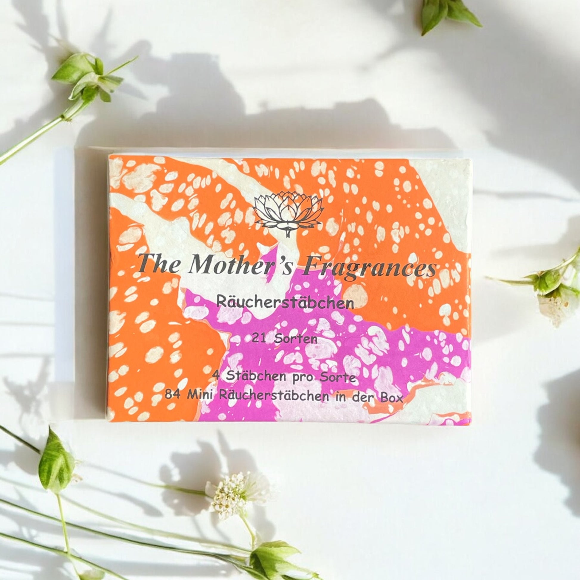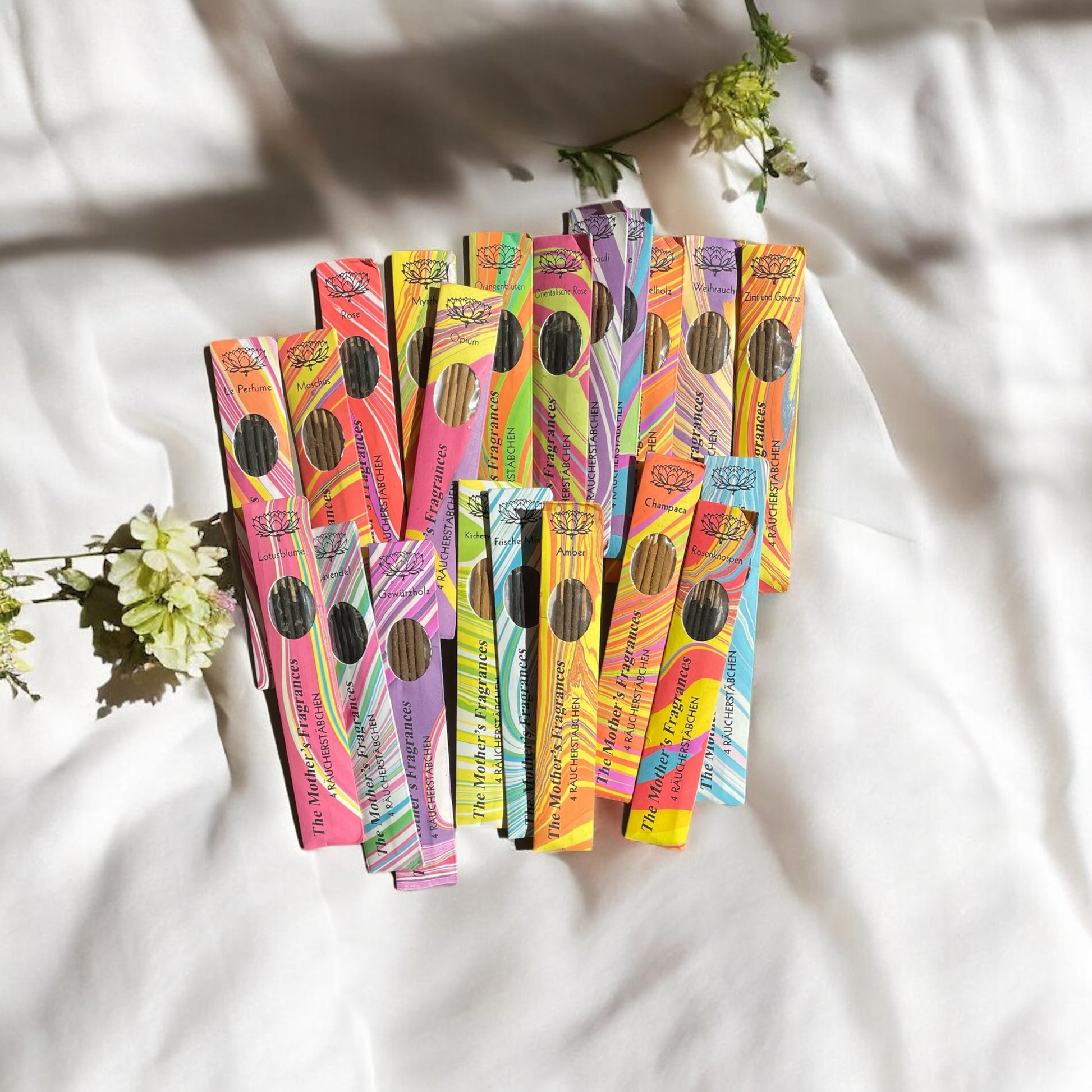 Finde durch die Mother´s Schnupperprobe deine Lieblingssorte heraus. Du hast hier alle 21 Sorten je 4 Stück extra verpackt, also insgesamt 84 kurze Räucherstäbchen.