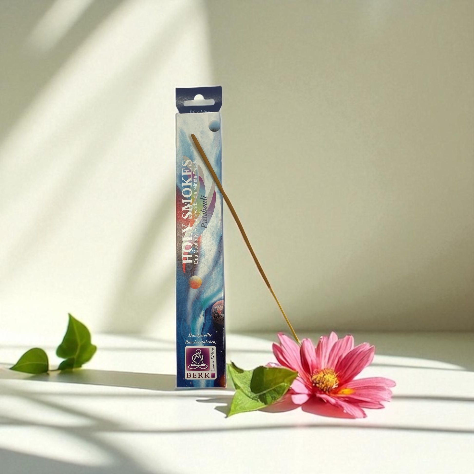 Holy Smokes „Blue Line“ Räucherstäbchen werden noch nach ursprünglichen, traditionellen Rezepten hergestellt. Es werden natürliche Substanzen wie Hölzer, Wurzeln, Harze, Kräuter und Öle gemischt und per Hand auf ein Bambusstäbchen gerollt.