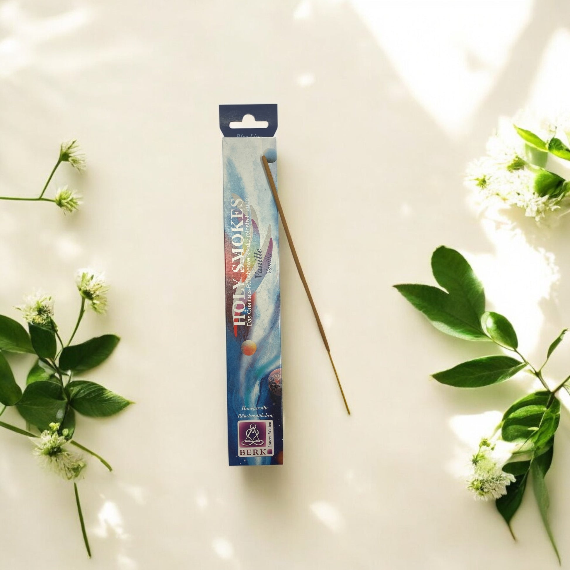 Holy Smokes „Blue Line“ Räucherstäbchen werden noch nach ursprünglichen, traditionellen Rezepten hergestellt. Es werden natürliche Substanzen wie Hölzer, Wurzeln, Harze, Kräuter und Öle gemischt und per Hand auf ein Bambusstäbchen gerollt.