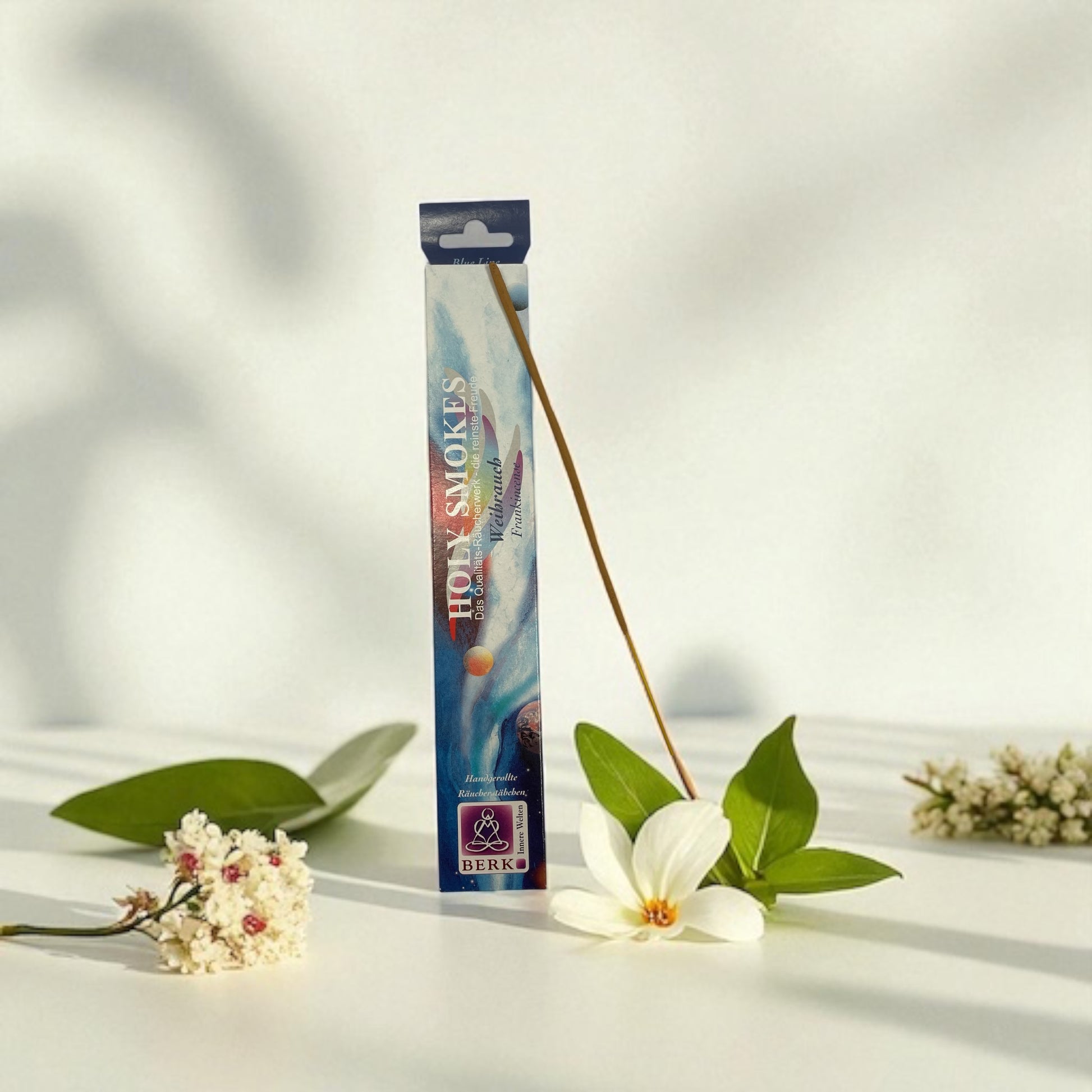 Holy Smokes „Blue Line“ Räucherstäbchen werden noch nach ursprünglichen, traditionellen Rezepten hergestellt. Es werden natürliche Substanzen wie Hölzer, Wurzeln, Harze, Kräuter und Öle gemischt und per Hand auf ein Bambusstäbchen gerollt.