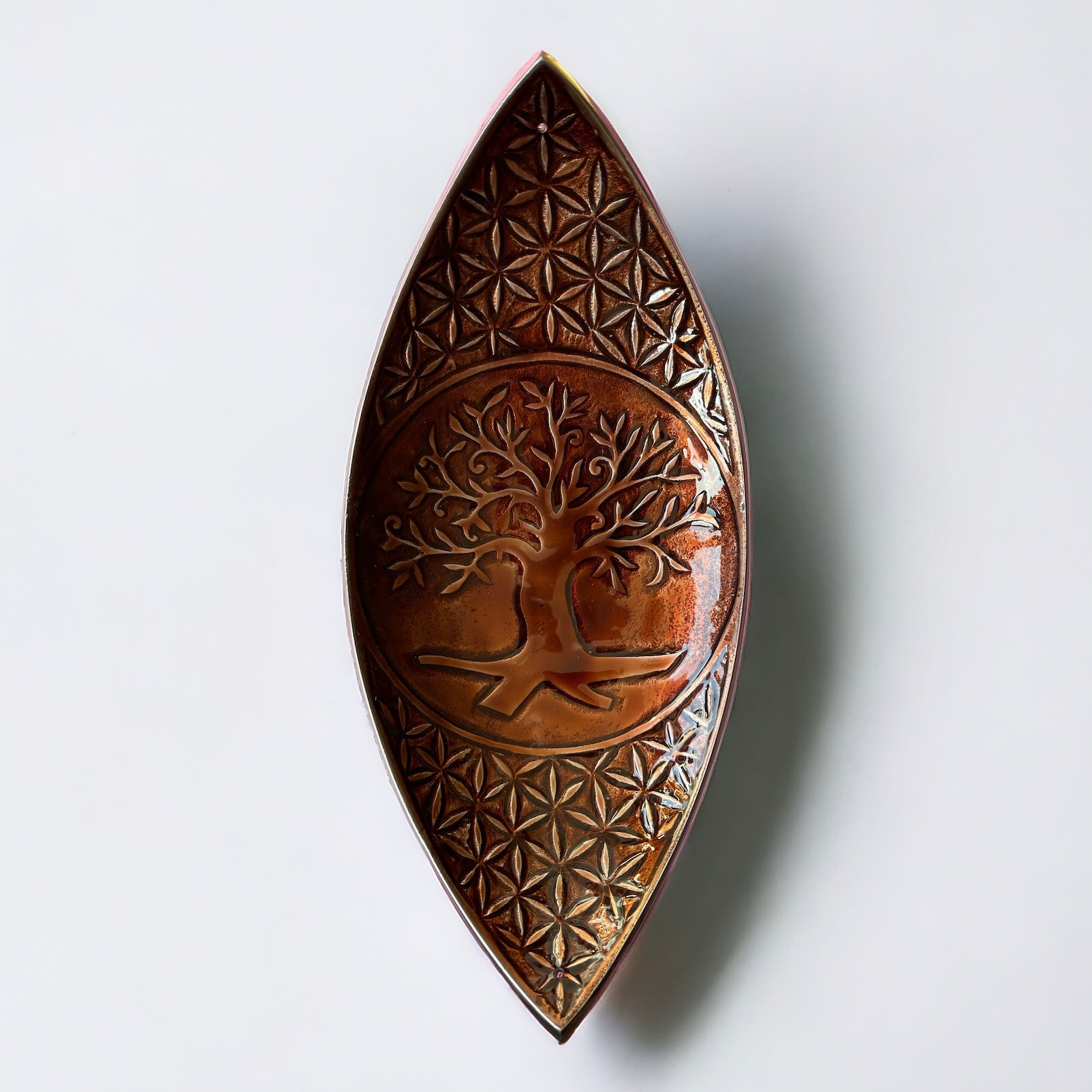 Erleben Sie die faszinierende Welt der magischen Räucherstäbchenhalter. Dieser ästhetische Räucherhalter verzaubert Sie in seiner Farbpracht des Bronzebraun, mit der Glasur des Lebensbaum und der Blume des Lebens. Mit diesen imposantem Schiffchen haben Sie die Möglichkeit, gleichzeitig zwei Räucherstäbchen zu entzünden – eines auf der rechten und eines auf der linken Seite – und es bleibt garantiert nichts daneben. Nutzen Sie alternativ die Schönheit dieser Schale, indem Sie Räuchersand und Räucherwerk hinzufügen.